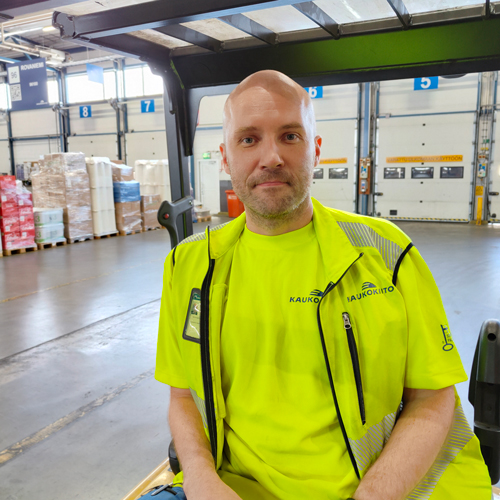 Terminaalityöntekijä Jari Saksa on työskennellyt Kaukokiidon Vantaan terminaalissa yli kymmenen vuotta. Hyvä työporukka, jossa toisia autetaan aina, on vaikuttanut siihen, että Jari viihtyy työssään.