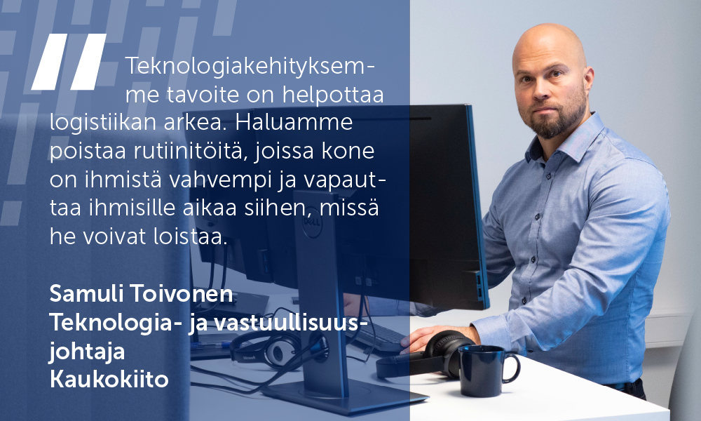 Kannattava ja korkealaatuinen logistiikka vaatii moniammatillista osaamista ja teknologisia innovaatioita. Kaukokiito on alan eturintamassa hyödyntämässä uusia ratkaisuja toimitusketjujen tehostamiseksi. Kaukokiidon teknologia- ja vastuullisuusjohtaja Samuli Toivonen tarkastelee artikkelissaan, miten teknologia uudistaa logistiikkaa, ja mitä asiakashyötyjä se tuo mukanaan.