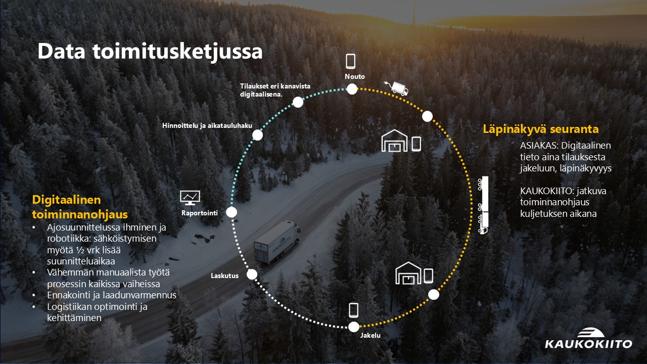 Logistiikan arki tuottaa roimasti dataa. Kuitenkin vasta viimeisen vuosikymmenen aikana sitä on alettu todella kerätä ja jalostaa siitä tietoa logistiikan arjen ja päätöksenteon tueksi. Tämä on vaatinut kuljetustilausten ja tilannetietojen sähköistämistä monikanavaisten datanvälitysratkaisujen avulla ja vaatinut myös asiakkailta prosessien digitalisoimista. Tänä päivänä kuljetustilaustemme sähköisyysaste on jo lähes 100 %. Se mahdollisti osaltaan siirtymisemme digitaaliseen toimitusketjuun ja luopumisen paperisista rahtikirjoista ensimmäisenä Suomessa toimivana rahdinkuljettajana vuonna 2020. Lisäksi teknologiaratkaisut ja data-analytiikka parantavat yhdessä datan laatua ja prosessointia esimerkiksi tarkistamalla, korjaamalla ja rikastamalla asiakkaan tilaamat kuljetuspalvelut tai kuljetusten osoitetiedot ja paikkaavat näin ihmisen inhimillisiä virheitä.